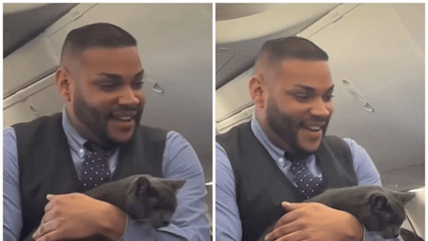 美国一架航班上,小猫“越狱”航空箱,空乘抱着它寻找“铲屎官”