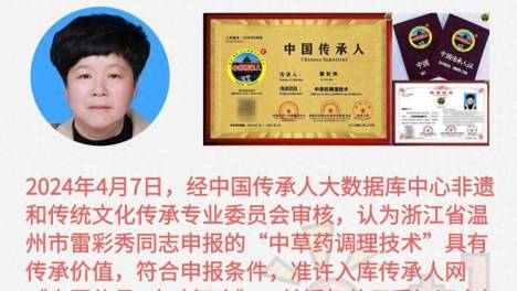 雷彩秀,出生于1972年,毕业于浙江省中等专业学校,祖传秘方传承人,拥有行医执照。她长期从事中医实践,形成清晰辩证风格,服务得到好评。