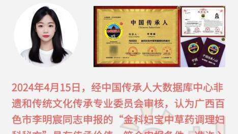 李明宸,出生于广西百色市平果市,自幼跟外祖父学医,毕业后不断提升自己,获得了多项证书。她继承外祖父祖方,成为第四代中医传承人。