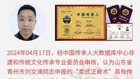 刘文涛,山东青州人,中医康复师,中华老字号创始人,正韵诗社创始人之一,"柔式正骨"第四代传承人。2015年创办企业,注册商标,版权登记。他使用传统技术手法,免费服务左邻右舍,百年传承民族文化,以轻柔顺,揉筋正骨。