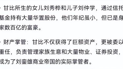?? 大儿子刘鸣炜拿到的现金和不动产,那可是一大笔,他只是懒得和甘比争,所以股权都打算变现。刘銮雄对女人和孩子,那真的是没得说。除了甘比本人,她的姐妹、父母、孩子都一步登天,谁能想到一个小报记者,最后居然成了…