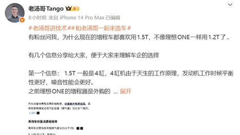 12月10日消息,理想汽车产品线负责人汤靖@老汤哥Tango发文称,有粉丝问他,为什么现在的增程车都喜欢用1.5T,不像理想ONE一样用1.2T了?他在此给大家分享几个信息,便于大家来理解车企的选择。1.5T…