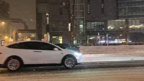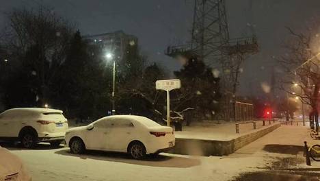 北京冬夜飘雪,静谧街景,车影如画。