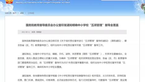 通知指出,加强中小学生作业、睡眠、手机、读物、体质管理(简称“五项管理”),关系学生健康成长、全面发展,是深入推进立德树人的重大举措。为确保“五项管理”相关政策规定落实落地,各省(区、市)教育督导部门要提高政…