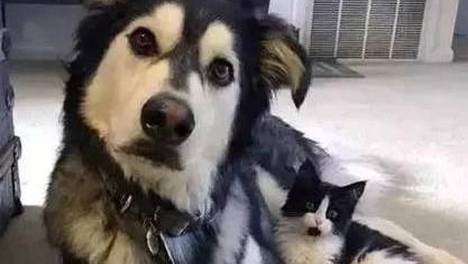 流浪猫上门认亲,与家中哈士奇“共用一张脸”,失散多年的兄妹?