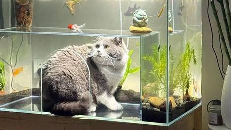 胖猫瘫坐鱼缸下,哈喇子流了一地,网友:胖成猪了还想着吃!