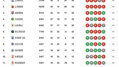 中超联赛积分榜:上海双雄稳居前二,蓉城第三,国安第四