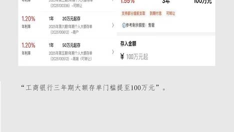 其中,3年期大额存单产品为“2025年第四期3年期个人大额存单”“2025年第三期3年期个人大额存单”,分别以100万元起存、20万元起存,利率均为1.55%,但以100万元起存产品目前已显示售罄。“百万门槛…