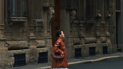 贾玲棕色皮衣亮相米兰时装周 简约盘发造型松弛又高级