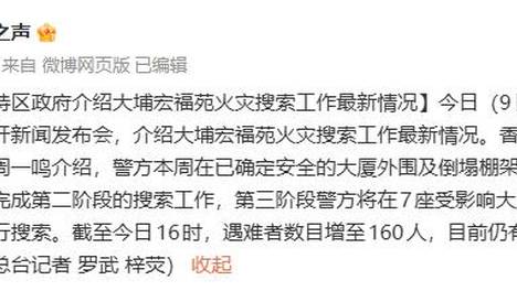 政知见2025-12-0917:46:46编辑|高语阳12月9日,大湾区之声发布消息,香港特区政府召开新闻发布会,介绍大埔宏福苑火灾搜索工作最新情况。香港特区政府警务处处长周一鸣介绍,警方本周在已确定安全的大…