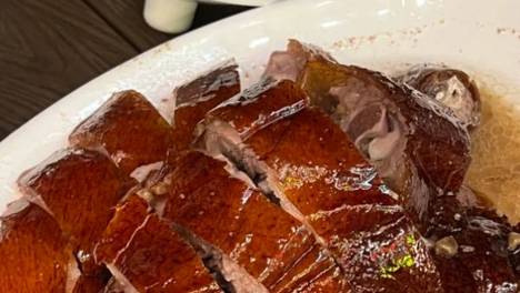 广式烧鹅,枣红脆皮下肉质多汁,蘸梅酱解腻