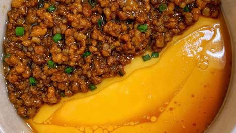 这时候偷偷告诉你个秘诀:用滤网过滤蛋液,蒸出来的蛋羹会像布丁一样丝滑!把炒好的肉沫均匀铺在蛋羹上,再淋上剩下的生抽和香油,这颜值,直接可以去餐厅摆盘了!看着这道金黄嫩滑的肉沫蒸蛋,是不是已经迫不及待想大展身手…