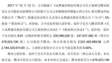 永辉超市开盘涨停 公司实控人向腾讯转让5%股份