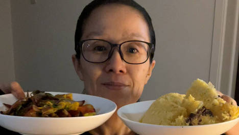 今日晚餐:芝士鸡肉焖饭;早餐见片尾;午餐(没拍):也是粘豆包,另加几片猪头肉