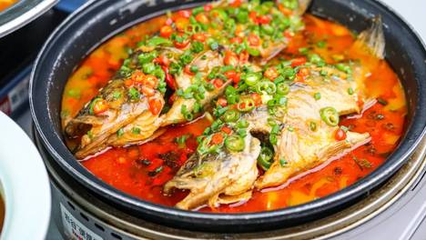 进店必点的一道菜火红的一大锅腌制过后的鱼肉/// 由于肉质的肥美吃货们对臭鳜鱼的态度也是格外分明恨它的人鄙夷不屑鱼肉经过腌制有一股近似于咸鱼的香味煨制红薯粉的高汤具有滋补的疗效浓稠的汤汁配上鲜美的洞庭湖甲…