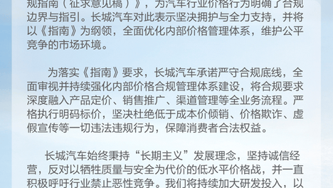 长城汽车承诺:严守合规底线 坚持明码标价