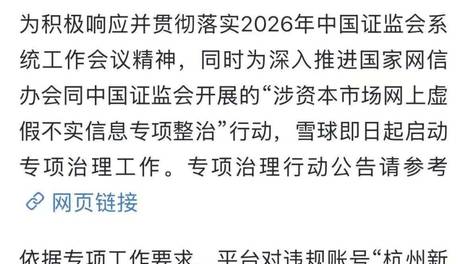 1月20日,今日,雪球安全中心发布《涉资本市场违规信息专项整治行动处置公告(一)》。雪球表示,为积极响应并贯彻落实2026年中国证监会系统工作会议精神,同时为深入推进国家网信办会同中国证监会开展的“涉资本市场…