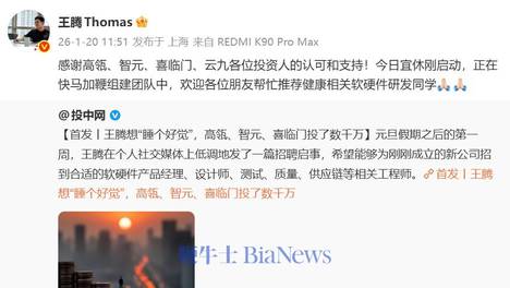 1月20日,据投中网,王腾的新公司“今日宜休”于近日完成了总规模为数千万元的种子轮融资,投资方包括高瓴创投、智元机器人、喜临门、云九资本等。根据规划,在2026年初完成团队组建及首轮融资后,“今日宜休”将在今…