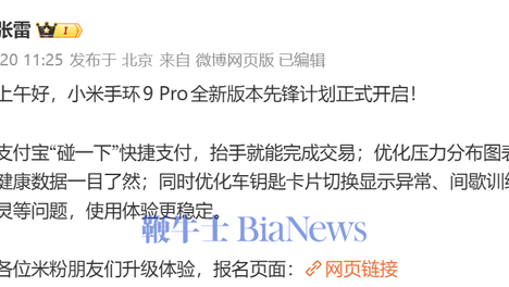 1月20日,小米集团手机部副总裁、可穿戴部总经理张雷今日宣布,小米手环9Pro全新版本先锋计划正式开启!功能新增支付宝“碰一下”快捷支付;优化压力分布图表的柱状图展示;同时优化车钥匙卡片切换显示异常、间歇训练…
