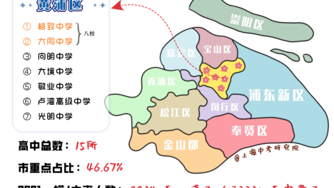 黄浦区上榜的市重点高中一共有7所,市重点占比为46.67%,其中格致中学、大同中学隶属八大,学校实力非常过硬哦~宝山区共有高中14所,其中有四所高中属于市重点,还坐拥一所四校分校——华二宝山。嘉定区共有高中1…
