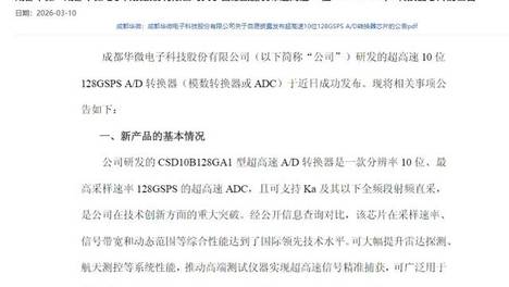 根据公告,成都华微研发的CSD10B128GA1型超高速A/D转换器是一款分辨率达10位、最高采样速率128GSPS的超高速ADC,且可支持Ka及其以下全频段射频直采,是公司在技术创新方面的重大突破。可大幅提…