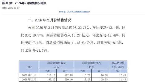 就四川养殖企业来看,新希望最新发布了2月生猪养殖经营数据显示,公司2026年2月销售商品猪98.22万头,环比下滑12.44%,同比增长19.97%。随着库存回补,二季度猪价拐点将现,猪价的反弹将带动全年猪价…