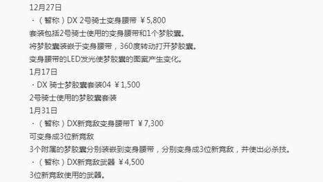最近网上也是公开了最新的关于假面骑士Zeztz最新订单情报,我们一起来看看吧。首先的话就是关于二骑和反派骑士的情报了,诺克斯变身的二骑将会在年底登场,而且使用的是全新腰带(不是换外壳,毕竟价格超过5000日元…