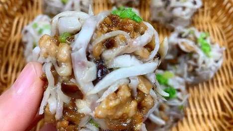 这里有个关键点:搅拌时要分3次加入少量花椒水或清水,每次都要等水分完全被肉馅吸收后再加下一次,这样调出来的肉馅才会鲜嫩多汁。将处理好的南瓜丝、鸡蛋碎、木耳碎、虾皮混合在一起,加入切好的葱末、1勺蚝油、少许胡椒…
